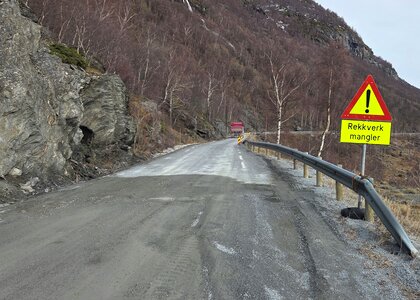 Ved begge stadane der det gjekk ras, er det skadar på vegen og rekkverket. Dette er skilta, og trafikantane må køyre forsiktig.