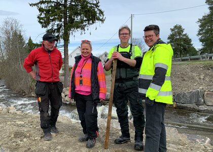 Morten Sommerfelt i Lenaelvens fiskerforening, klima- og miljørådgiver Inger Lise Willerud i Østre Toten kommune, biolog Atle Rustadbakken i Sweco og seniorrådgiver Claire Bant i Innlandet fylkeskommune har samarbeidet om tiltaket som vil hjelpe ørreten som vandrer i Slukelva.