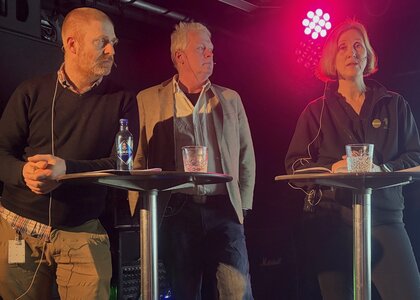 Lars Gillund i Klosser Innovasjon ledet en panelsamtale mellom Helga Helland, Klosser Innovasjon og Bjørn Fjellstad, CEO Vestre.