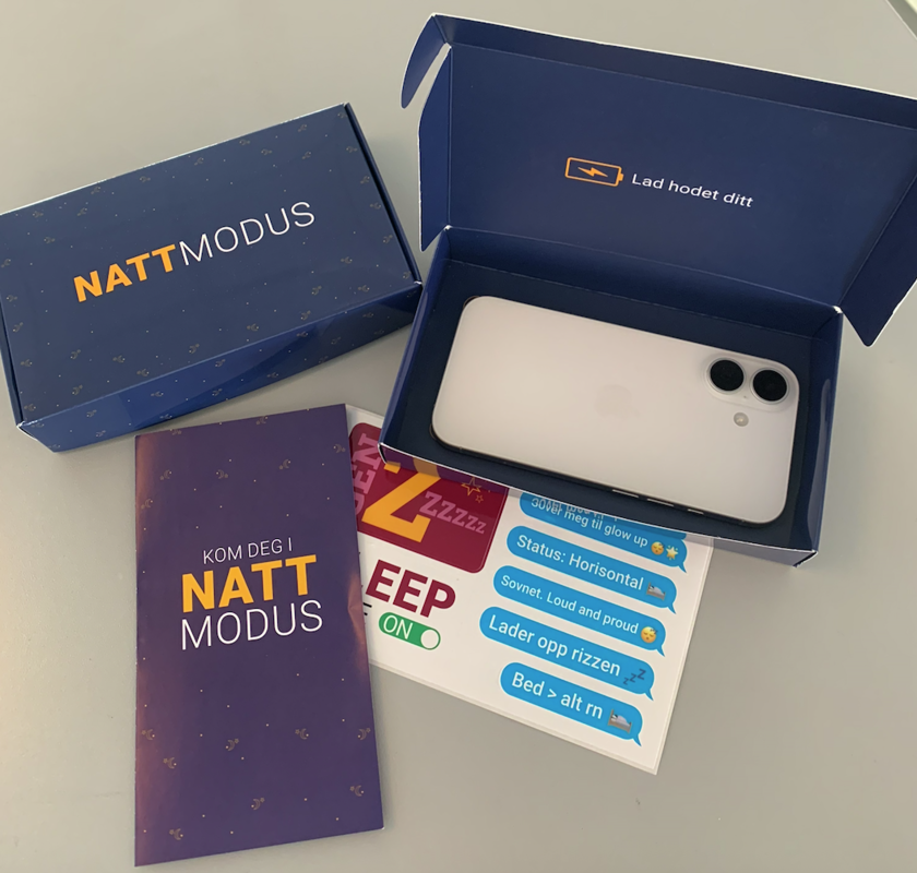 Alle elever får utdelt et søvn-kit, en eske som blant annet inneholder tips til bedre søvn og klistremerker. Og esken, den blir en seng for telefonen, slik at de kan legge den vekk når de selv skal sove.