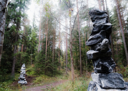 Kunstverket «Vokterne» plassert i skogen. Kunstneren er Mattias Härenstam i Hamar kommune