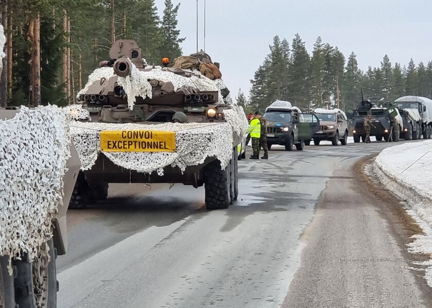 Militær kolonne på fylkesveg under øvelsen Cold Response 2022.