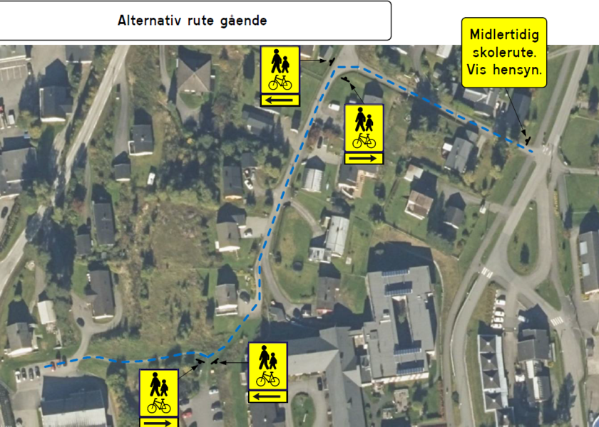 Ruta som elever ved Aurvoll skole og andre fotgjengere må bruke, blir godt skiltet. Også der fotgjengerne må gå utenom vanlig veg, blir det brøytet og strødd i vinter.